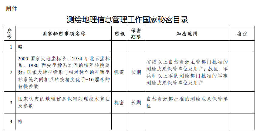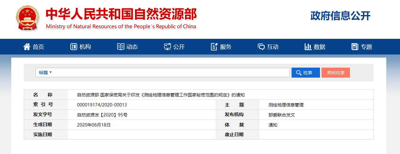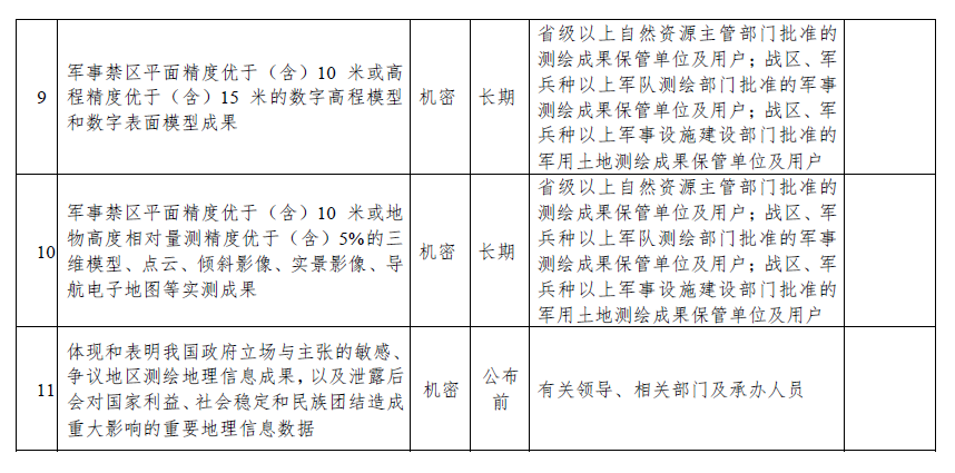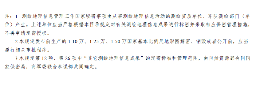 2020年6月18日,自然資源部、國家保密局發(fā)布新版的《測繪地理信息管理工作國家秘密范圍的規(guī)定》(自然資源發(fā)【2020】95號),新規(guī)于2020年7月1日起施行。2003年12月23日國家測繪局、國家保密局聯(lián)合印發(fā)的《關(guān)于印發(fā)<測繪管理工作國家秘密范圍的規(guī)定>的通知》(國測辦字〔2003〕17號)同時廢止。