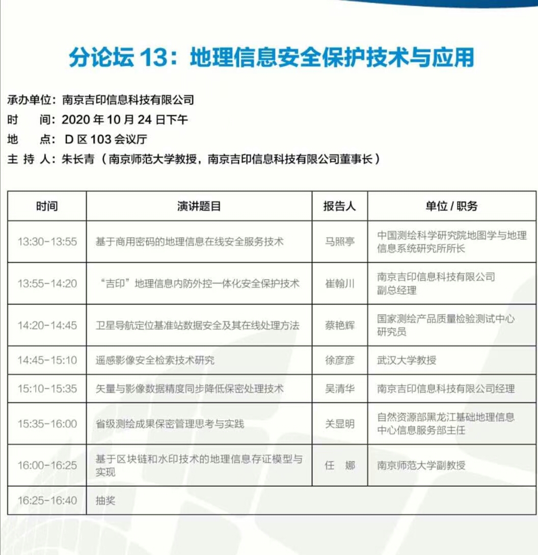 此外,南京吉印于24日13:30-17:30在南寧國際會展中心D區(qū)103會議廳開展“地理信息安全保護(hù)技術(shù)與應(yīng)用”分論壇,地理信息行業(yè)的專家教授、學(xué)者等多人將圍繞主題發(fā)表演講報告,共同探索地理信息數(shù)據(jù)的安全與保護(hù)。