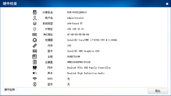 1、【硬件檢查】可檢查計(jì)算機(jī)的基本硬件配置信息,包含計(jì)算機(jī)名、用戶名、系統(tǒng)類型、IP地址、MAC地址、處理器型號(hào)、內(nèi)存、顯卡、主板、主硬盤、網(wǎng)卡、聲卡、WIFI、藍(lán)牙等硬件信息,檢查計(jì)算機(jī)硬件環(huán)境是否合規(guī),是否具備無(wú)線通信能力。
