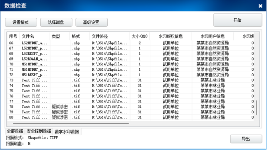 3、【數(shù)據(jù)檢查】能夠?qū)τ?jì)算機(jī)設(shè)備上存儲(chǔ)的所有測(cè)繪地理信息數(shù)據(jù)進(jìn)行掃描,支持顯示數(shù)據(jù)中的水印或加密信息;數(shù)據(jù)的涉密和非涉密類型會(huì)根據(jù)數(shù)據(jù)的空間參考和光譜信息等進(jìn)行自動(dòng)識(shí)別,輔助判斷數(shù)據(jù)是否涉密。