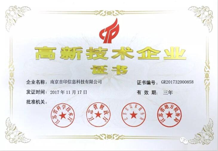 2017年11月17日,經(jīng)有關(guān)部門組織專家評審、公示等程序后,南京吉印順利通過高新技術(shù)企業(yè)認(rèn)定,獲得“高新技術(shù)企業(yè)證書”。